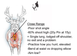 In summary, the shot placement is typically high and at a steep angle resulting in a single lung shot, no pass through with the arrow lodged in the off shoulder. Certainly, practice and shot placement is key, but one suggestion could be to aim slightly lower than normal and error on hitting lower, this can also be helpful when the deer “duck the string”.